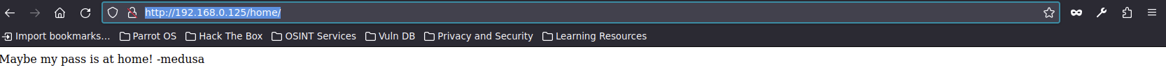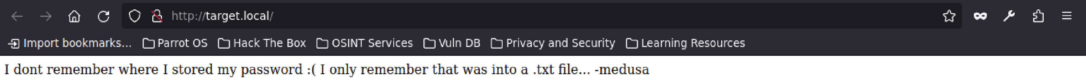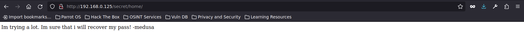 Knowing there’s a ssh service running and the medusa’s username I wondered if the password was already presented to me earlier. The only txt file I discovered was .secretnote.txt and it contained the Ihavebeenalwayshere!!! string. Was that actually a password?