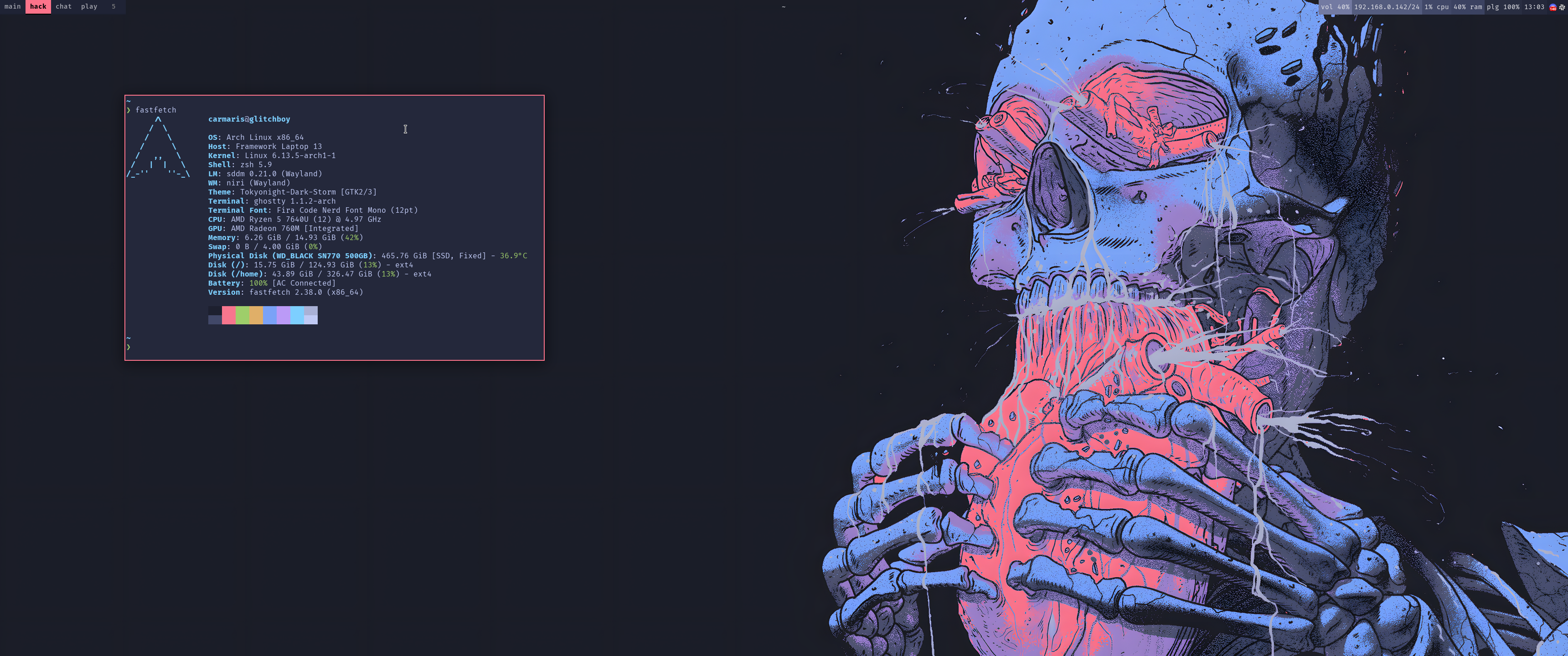 After ~6 months of reluctant lurking, I bought the second-hand AMD Ryzen 5 7640U-based Framework Laptop 13 with 16 gigs of RAM that I’m going to upgrade to 32. I replaced the broken bezel and keyboard (right alt was missing) in less than 1 hour, installed Arch Linux and started to enjoy computing again.