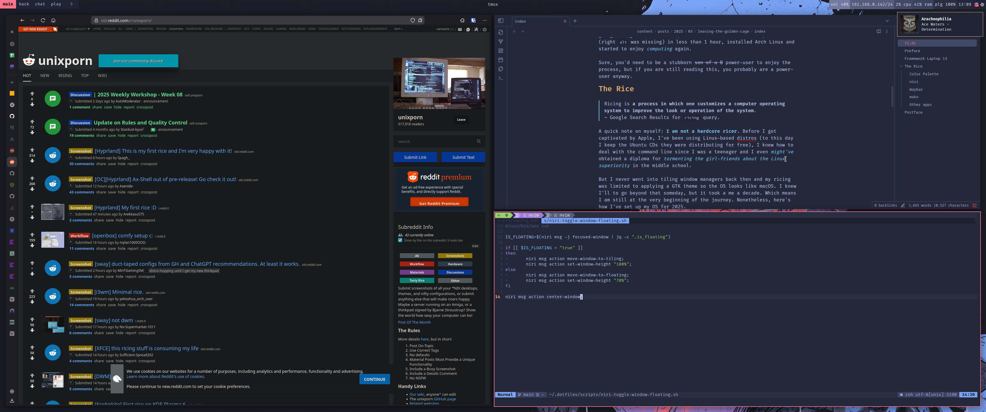 At the heart of my setup is this tiny Wayland Compositor called niri. I saw it on r/unixporn few months ago and loved the idea instantly. Having the infinite canvas of tiled windows that I can manipulate without even having to touch the mouse? That’s the dream!